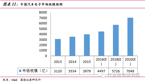 汽車電子類產(chǎn)品通常落后消費(fèi)類電子產(chǎn)品一個(gè)時(shí)期,正如過(guò)去幾年手機(jī)行業(yè)所經(jīng)歷的那樣,汽車業(yè)正在由“功能機(jī)”向“智能機(jī)”發(fā)展,這將給電子行業(yè)帶來(lái)新的增長(zhǎng)引擎。受惠于各國(guó)汽車安全政策加持,近期汽車電子輔助行車安全的趨勢(shì)已十分明確,越來(lái)越多類似TPMS、倒車影像、自動(dòng)剎車系統(tǒng)等新應(yīng)用崛起。各大車企、互聯(lián)網(wǎng)公司紛紛加快在車聯(lián)網(wǎng)和自動(dòng)駕駛領(lǐng)域的產(chǎn)業(yè)布局,車聯(lián)網(wǎng)有望成為第一個(gè)實(shí)現(xiàn)的物聯(lián)網(wǎng)應(yīng)用空間廣闊,存量與增量汽車市場(chǎng)規(guī)模可觀。2015 年中國(guó)汽車電子市場(chǎng)規(guī)模為3,979億元,同比增長(zhǎng)12.6%,2013~2015年中國(guó)汽車電子市場(chǎng)規(guī)模平均增長(zhǎng)率為13.7% 。中商產(chǎn)業(yè)研究院預(yù)測(cè)2016年中國(guó)汽車電子市場(chǎng)規(guī)模為4497億元。賽迪顧問(wèn)預(yù)計(jì)到2016年中國(guó)汽車電子市場(chǎng)將保持 10%以上的增速,同時(shí)汽車電子在整車成本中的占比將超過(guò)50% 。我們判斷中國(guó)汽車電子市場(chǎng)增長(zhǎng)方式正在由汽車產(chǎn)量增長(zhǎng)轉(zhuǎn)向功能需求驅(qū)動(dòng)。